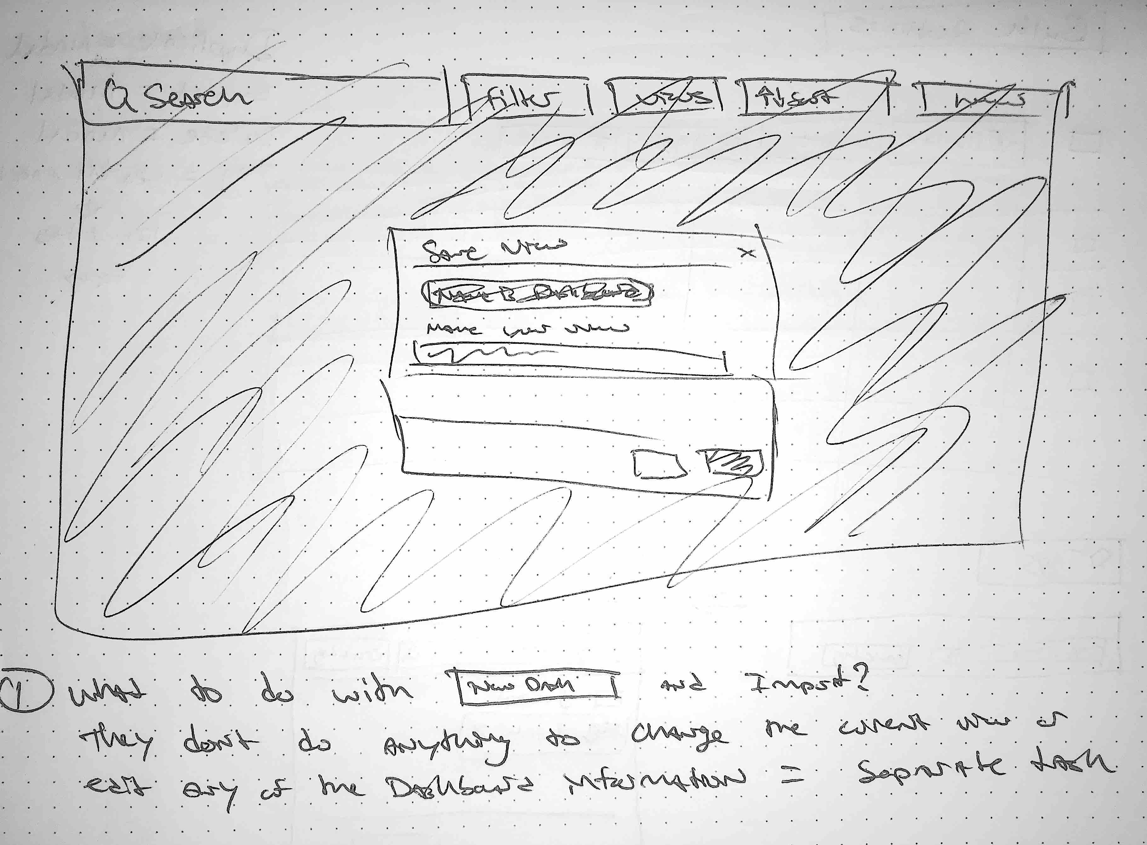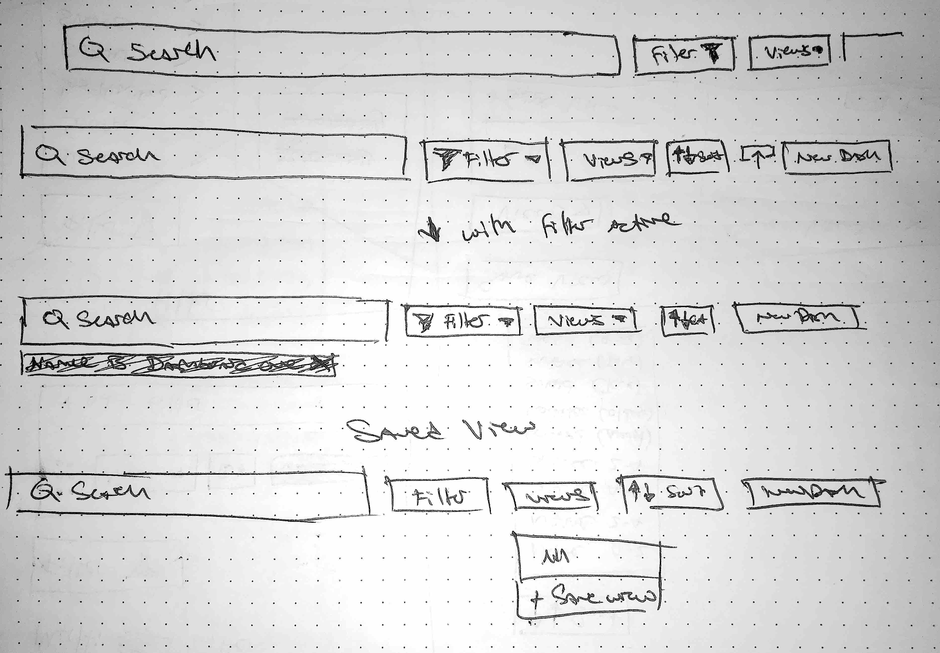 My solution to this problem was to bring visual clarity to these elements by placing them in their own separate locations. You can see from the image above, my plan was to nest these elements in a parent Child sibling manner. Navigation being the highest level, adding a new dashboard through importing or starting from scratch, and then the list view, with the search, filter, bulk actions, and saved view UI. I believe this to be a more helpful option for users and the law of common region can back me up on that.